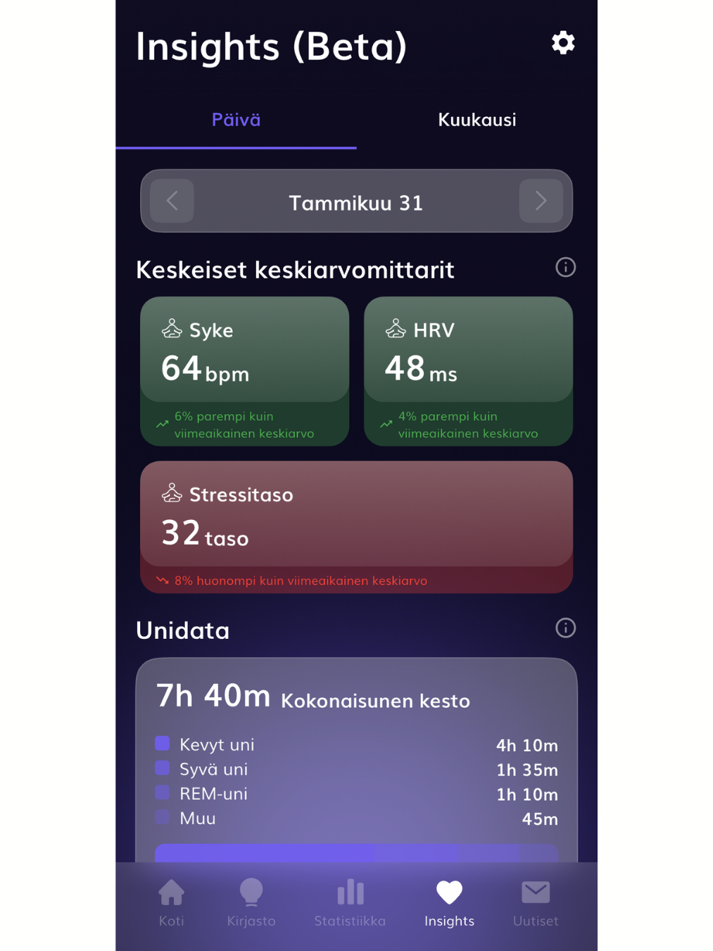Insights samlar de viktigaste välbefinnandemåtten i en och samma vy och gör det möjligt att följa både dagliga värden och trender över längre tid.