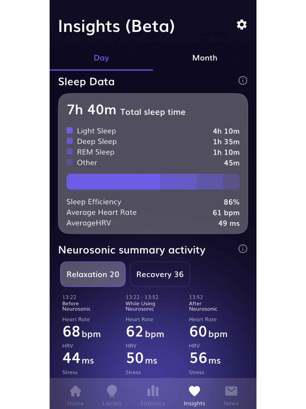 Neurosonic Insights hjälper dig att förstå hur sömn, stress och återhämtning förändras i din vardag och hur användningen av Neurosonic syns i mätvärdena.