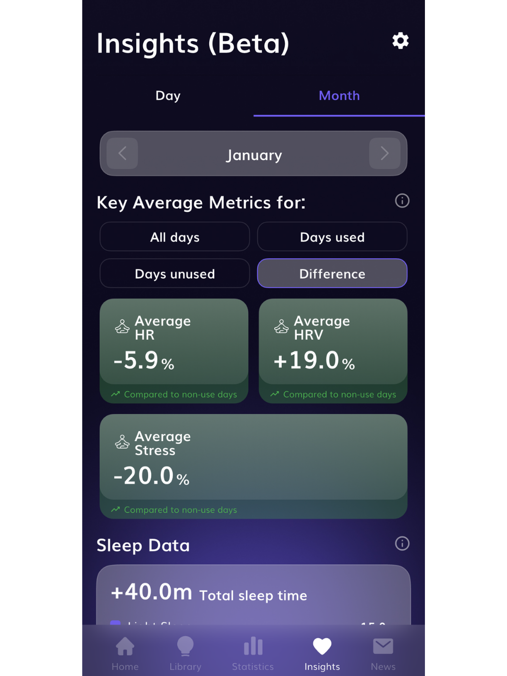 Visar hur värdena skiljer sig mellan användningsdagar och dagar utan användning. Detta kan hjälpa dig att bedöma om Neurosonic-användning syns i ditt välbefinnande (till exempel sömnrelaterade eller stressrelaterade mätvärden).