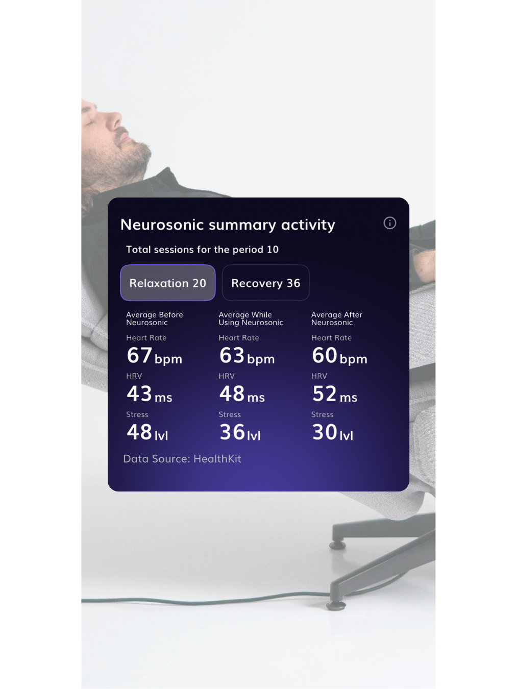 Neurosonic-sammanfattningen visar hur en enskild Neurosonic-session påverkade ditt välbefinnande. Den visar puls, HRV och stressnivå: